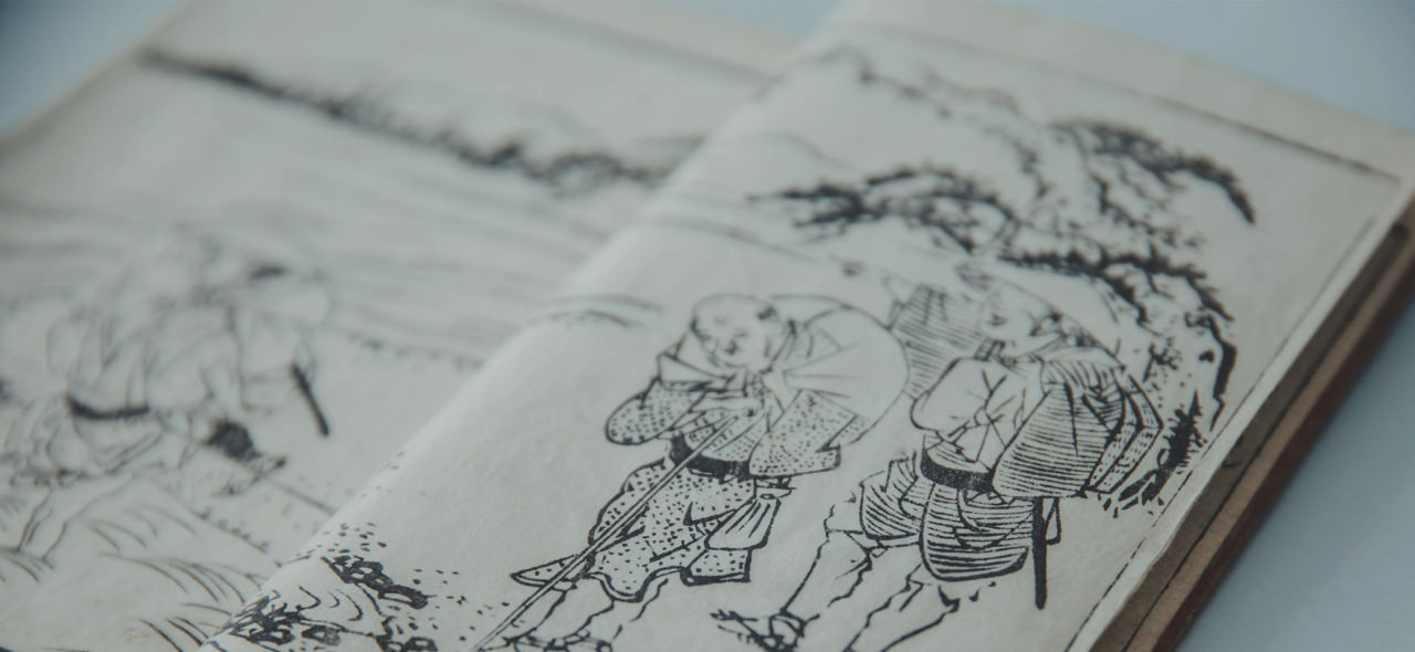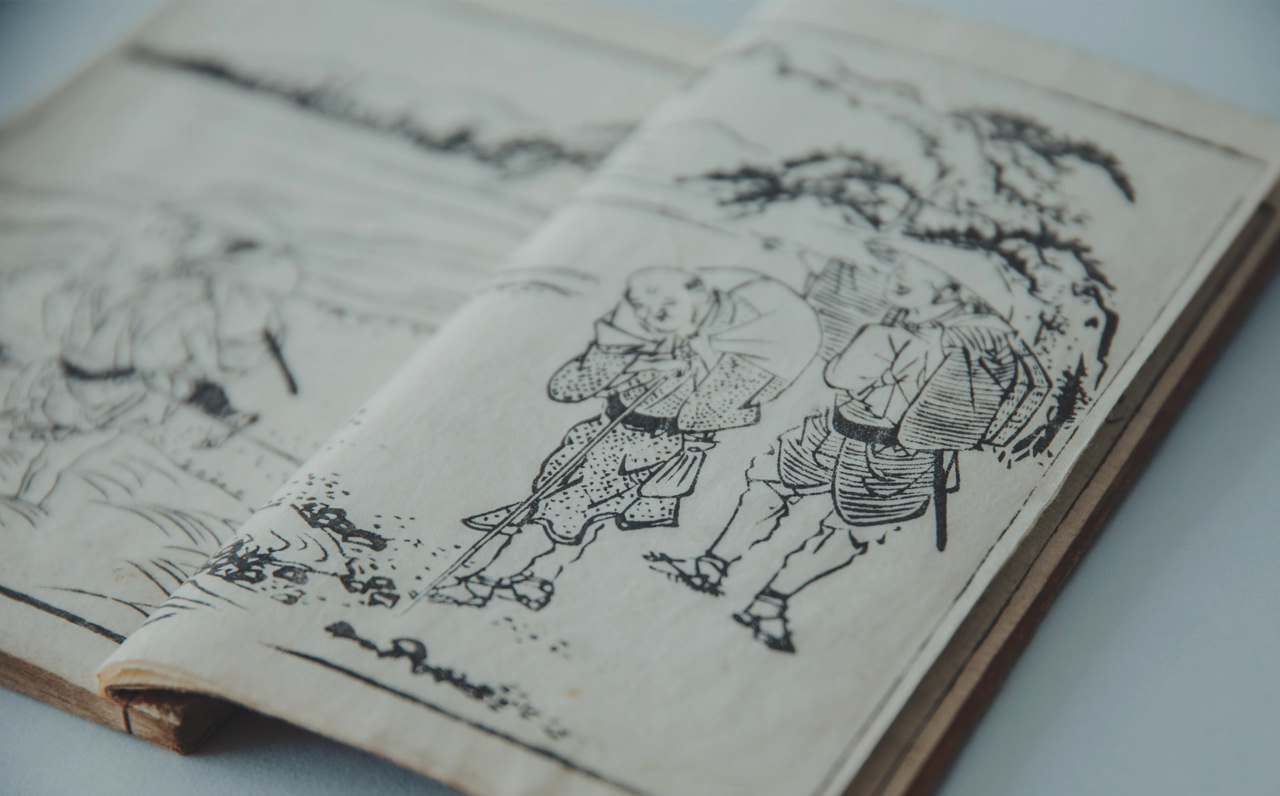当時の印伝は漆を全面に塗ったあと、揉んでひび割れさせたことから、「地割印伝」、ひび割れの様子が、松の皮に似ていることから「松皮印伝」とも呼ばれ、 江戸の洒落者たちは印伝の巾着や莨入、早道などを身につけ粋を競いました。 『こしにさげたる いんでんのきんちゃくをいだし みせる』。 弥次喜多の珍道中として知られる十返舎一九の滑稽本『東海道中膝栗毛』(1802〜1809年刊)にも記されているように、印伝は江戸の人々に愛好されたことがうかがえます。
