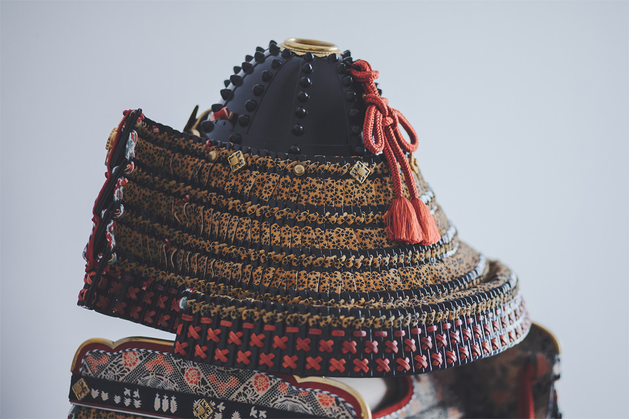 武士が台頭する時代には、多様な染色技法を駆使した鎧や兜が武将たちの勇姿を飾りました。 甲斐を治めた武田家ゆかりの品として伝わる鎧兜がその好例。 小桜模様の装飾革で華やかに彩ったさまは、武勇の誉れ高い武田家の威光を物語るものとして伝わっています。