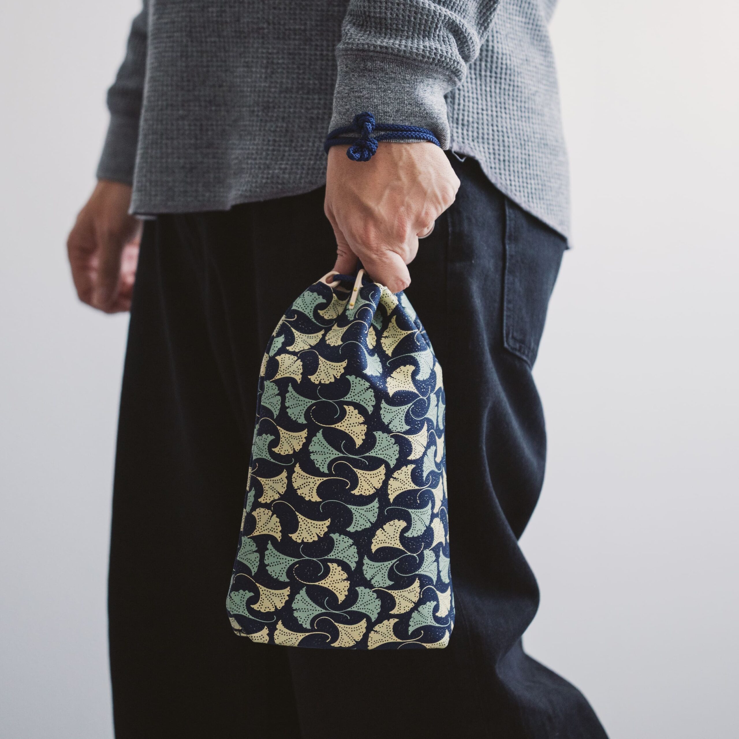 青山店45周年の節目にあたり、紺革に黄色と緑の更紗をあしらい、洗練されたモダンな風合いへと昇華させました。
