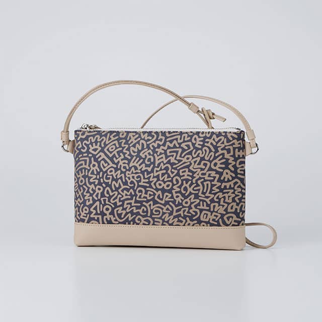 鹿革に、漆付けや更紗の技法で模様を彩る印伝。その組み合わせにより実に多彩な意匠をつくることができますが、キース・ヘリングのアートのような鮮やかな原色の色づかいや、さまざまな形のアイコンが密にランダムに散りばめられたものは、これまで経験したことのないものでした。