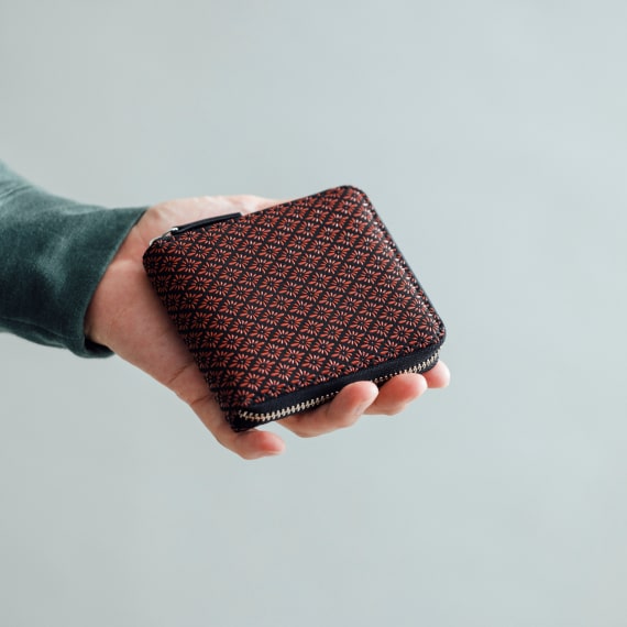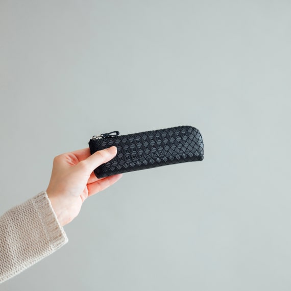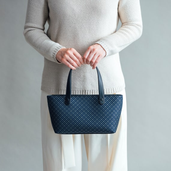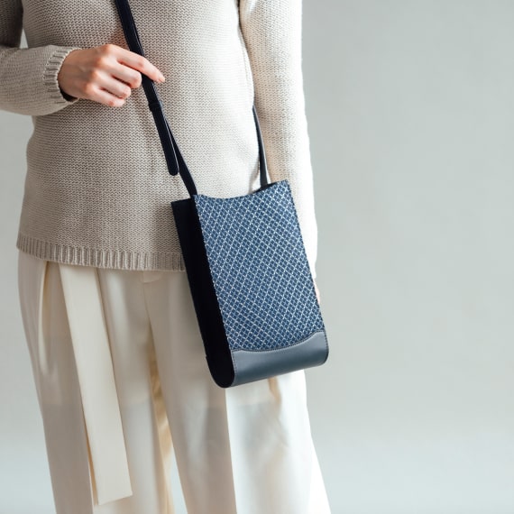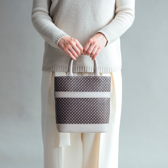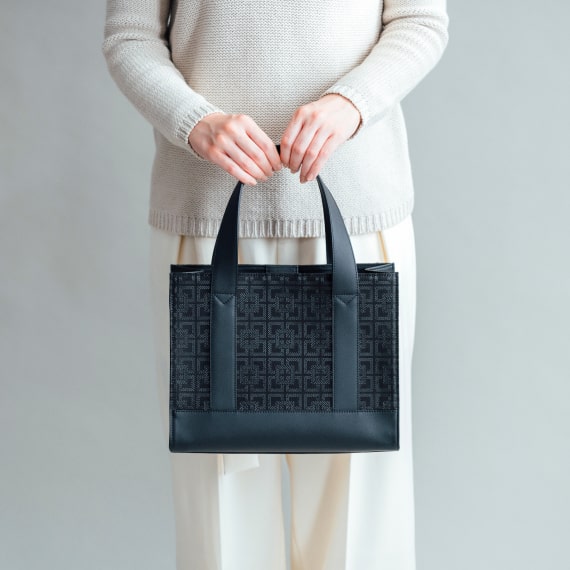 大小のスクエアをそれぞれ異なるレイヤーで構成したオリジナルのバッグ専用パターン。縦と横のラインを異なるドットの形で漆付けすることで立体的なフォルムに。見る角度によってスクエアの表情が変わり、大人のラグジュアリーな気品が艶めきます。