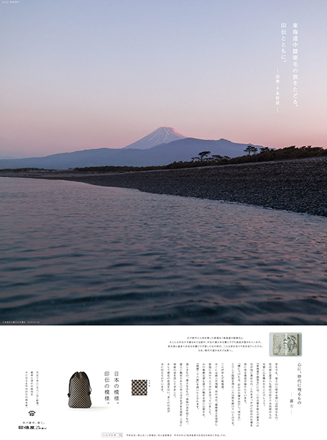 江戸時代に人気を博した滑稽本 『東海道中膝栗毛』。 弥次郎と喜多八が印伝を腰に提げ旅したその道中には、 現代にまで受け継がれる日本の模様にちなんだ場面がありました。 さあ、時代の道中をめぐる旅へ。