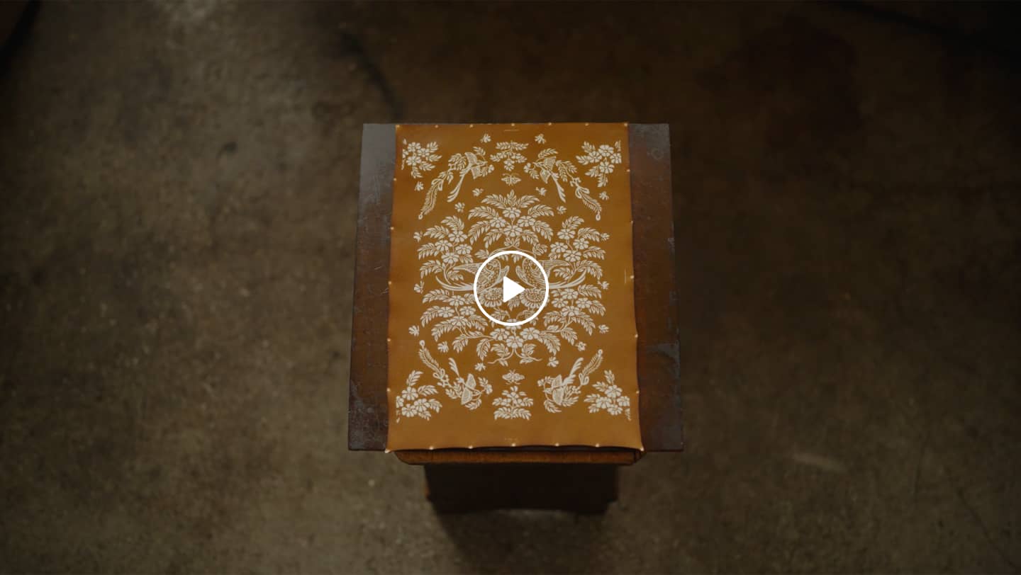 この度、印傳屋の「第76回正倉院展」協賛を記念し、「燻」の技を活かした特別な印伝を製作。印傳屋が現在も使用する燻の技は、藁をいぶした煙で、革に模様をつけるもの。奈良時代にも使われたであろうこの技を用い、正倉院に納められている「碧地金銀絵箱」(へきじきんぎんえのはこ)の装飾文様の印伝を燻べてつくりあげました。