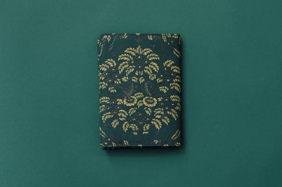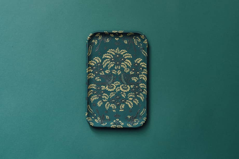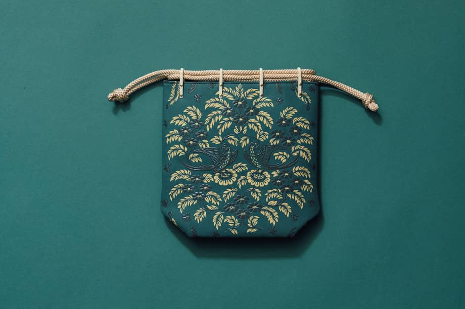 挑んだのは正倉院に納められている「碧地金銀絵箱」(へきじきんぎんえのはこ)の花鳥文様。碧の地に、花枝をくわえた鳥や蝶などが金泥・銀泥で描かれる華麗で気品に満ちたもの。 当時の輝きと色彩を想像しながら、革は特別に青碧の色に染め上げ、模様は蒸栗色の更紗と鈍色の漆で表現しました。天平文化の美の趣を、少しでも感じていただければ幸いです。