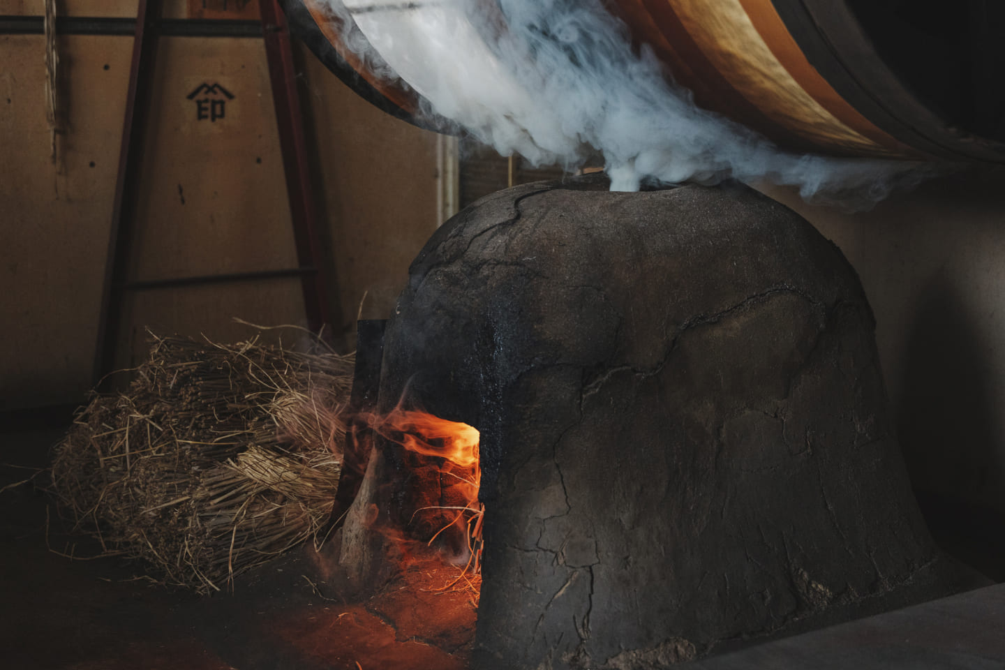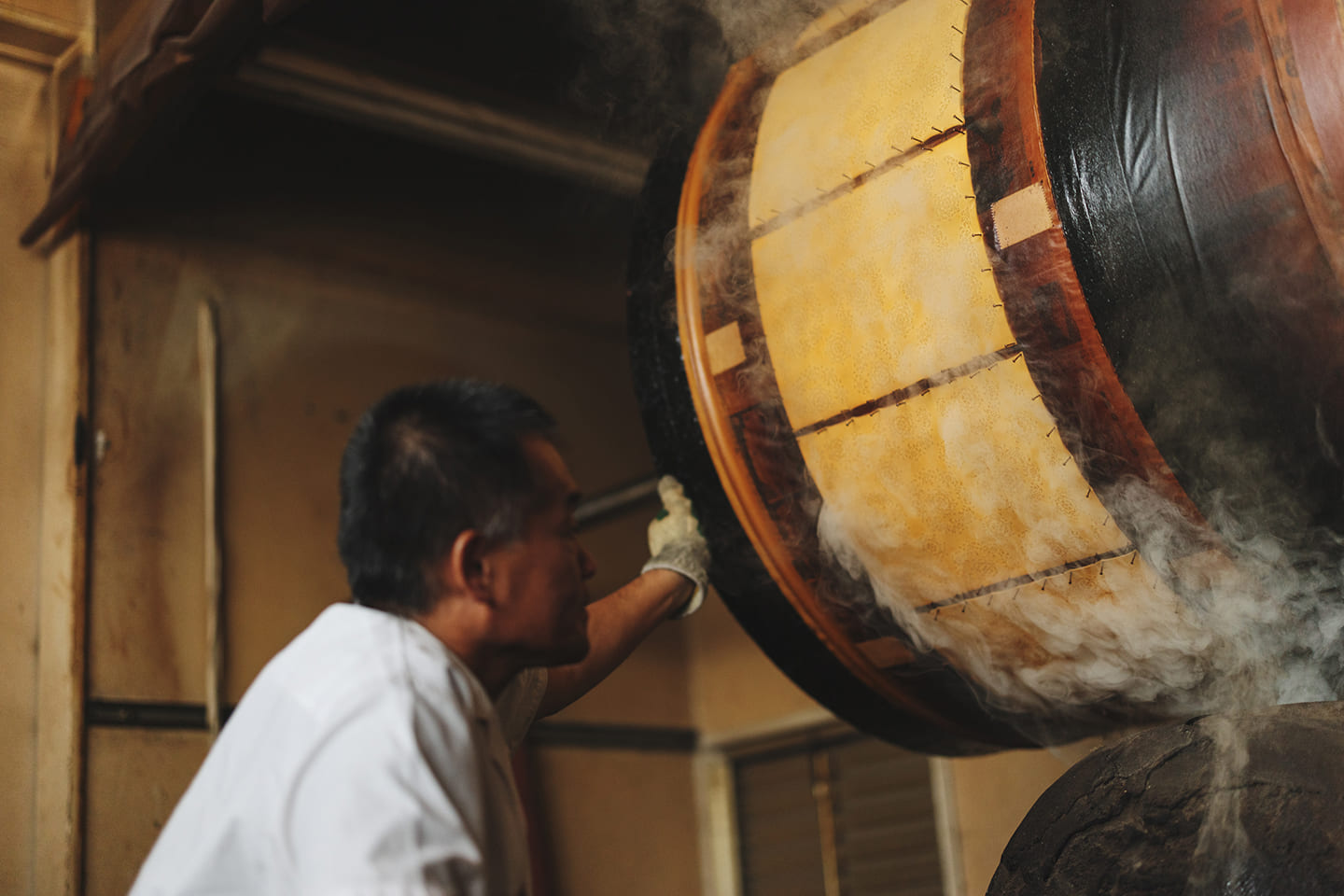 燻の工程は、まず焼き擦りをした鹿革に模様の部分を糊で防染します。これをタイコに貼り付け、稲藁の煙をあてて燻していきます。この技ができるのは、印傳屋でただ一人の燻職人・神宮寺秀哉。竈から上る煙の出具合を見ながらタイコを回転させ、左右に移動させながら革にまんべんなく煙をあてていく。長年養われた感覚でこれを繰り返すこと一日半。さらに一日寝かせたあとは仕上げの糊掻き。防染した糊をヘラで掻くと、白い模様が浮かび上がります。