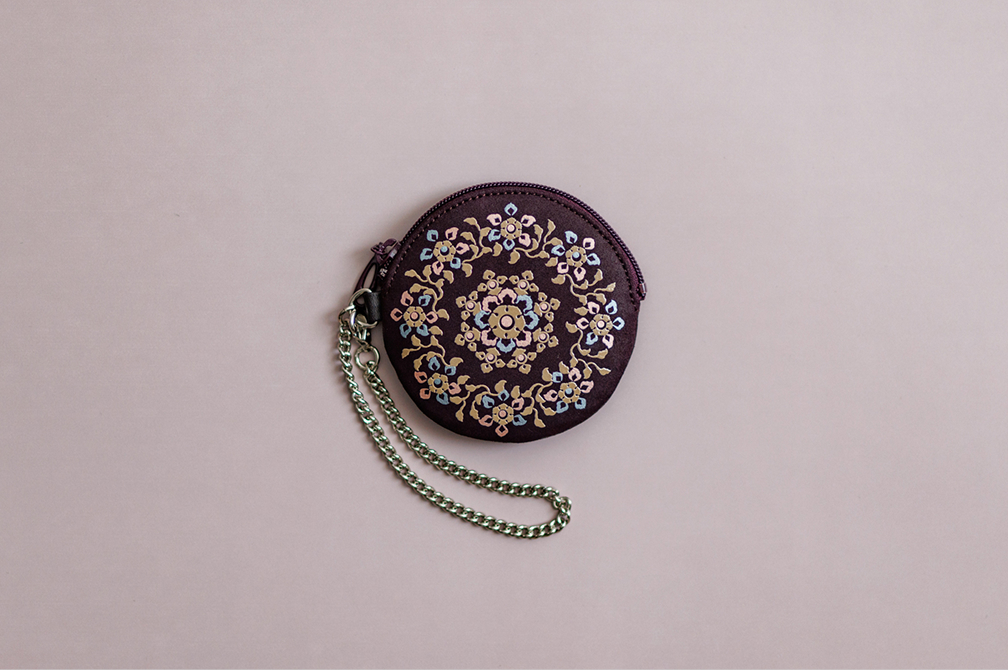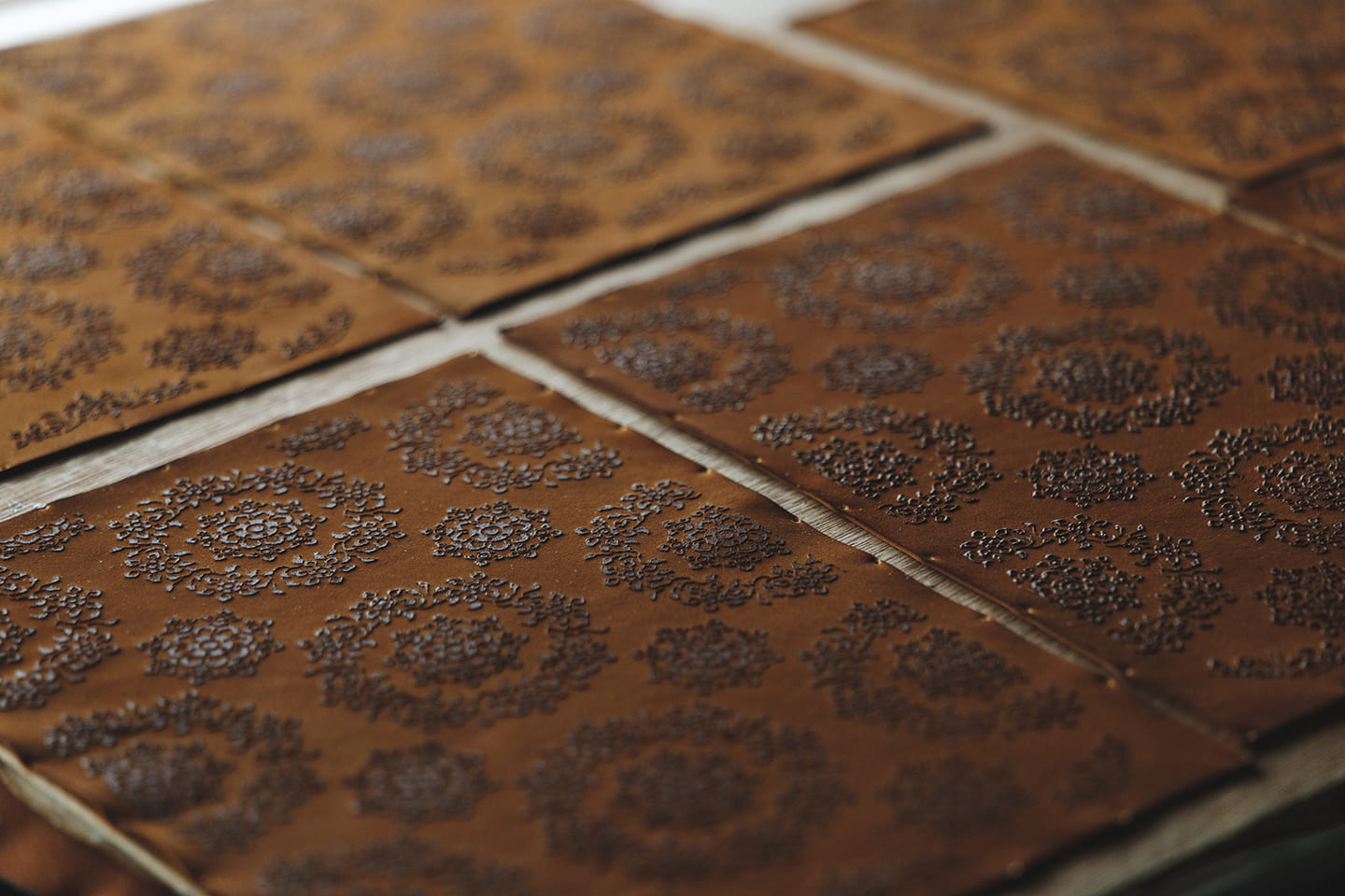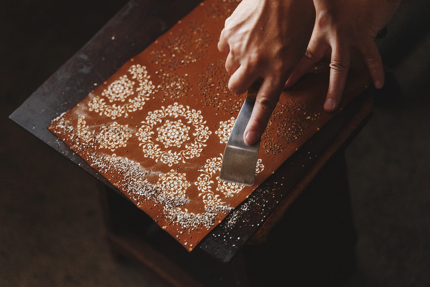 印伝の源流にある天平文化の匠の技に敬意をこめて、正倉院の宝物から着想を得た印伝をつくる。