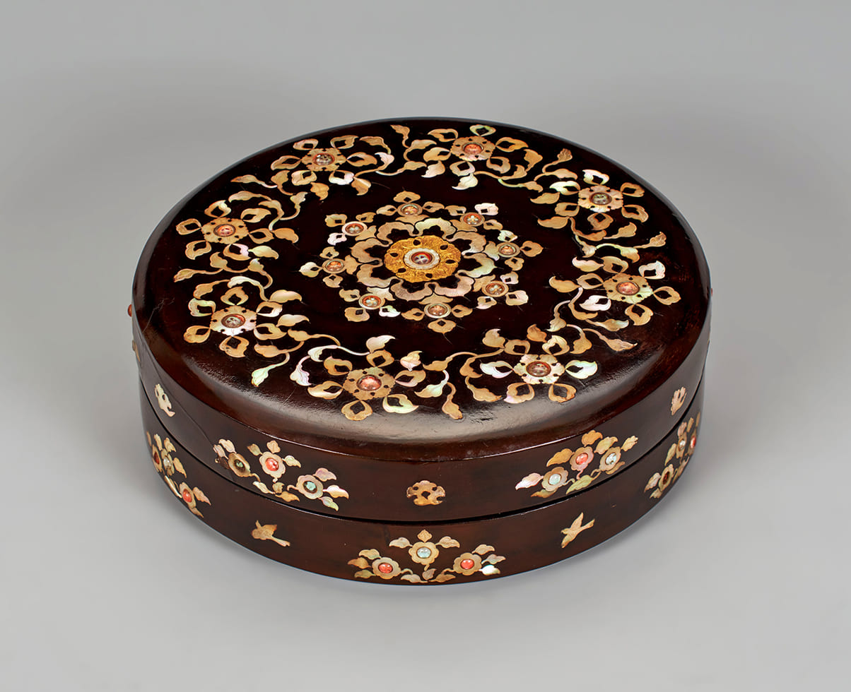 宝石で飾った革帯「紺玉帯」を納めるための箱で、木胎黒漆塗りの漆器に螺鈿や水晶で鳥や花の文様が施されています。日本において黒漆塗りと螺鈿技法を用いた最古級のもので、さらに文様に切り抜いた金を漆塗で定着させる金平脱が使われています。当時の漆工の技と美を今に伝える貴重な宝物です。