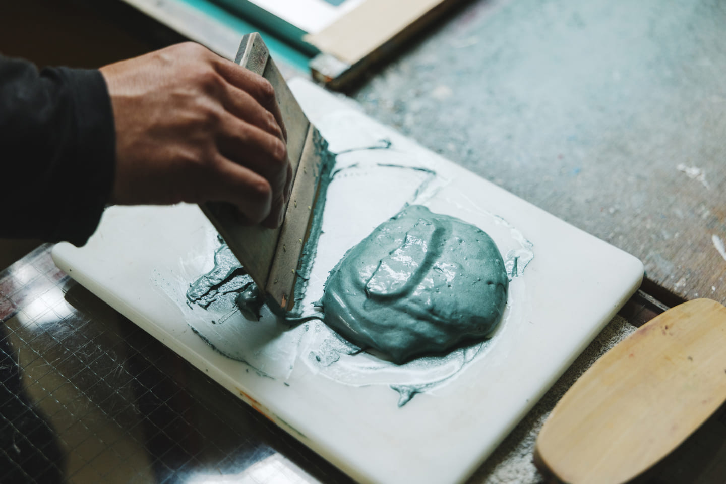 「色合いを薄めたりしてもマットな印象が拭えなくて。そこでそれぞれの顔料に普段は使用しない微細なパールの顔料を混ぜてみました。すると色彩に光の反射が生まれ、いい意味で色がぼやけてくるんです。色味を曖昧にしつつ、夜光貝のようなきらめきも出てくる。この線ならいけそうだと思いました」