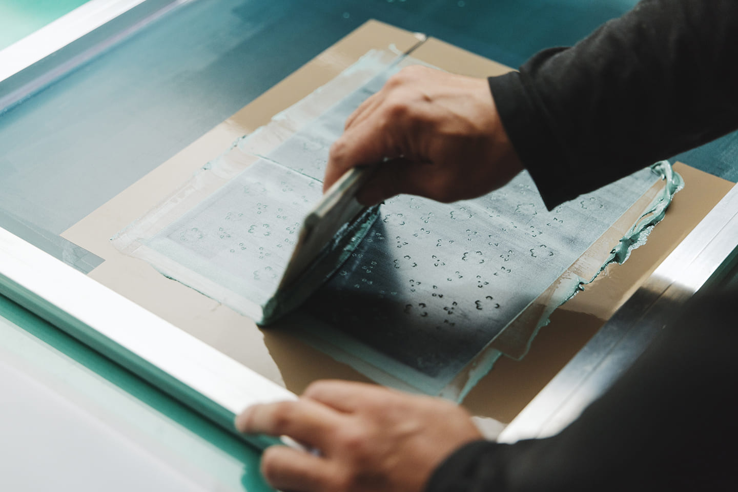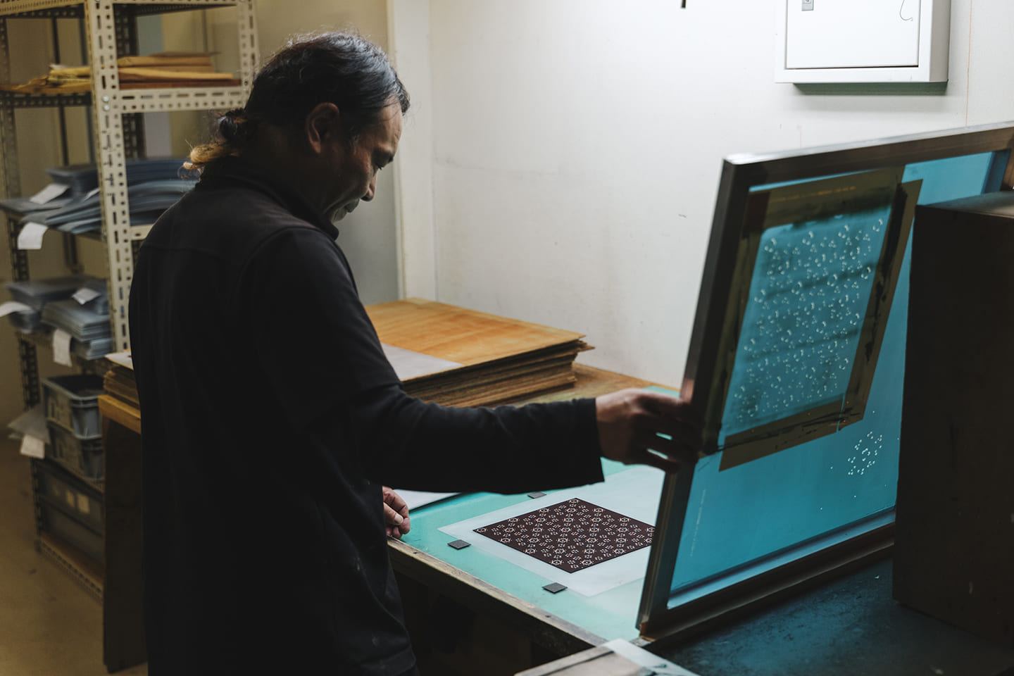 課題は見る角度によって一枚一枚の花弁の色彩が虹のように見える螺細の特徴をいかに表現するか。更紗の職人・戸澤武士に求められたのは、均一に見えない複雑な色合いを、2色の更紗の顔料でつくりだすことでした。