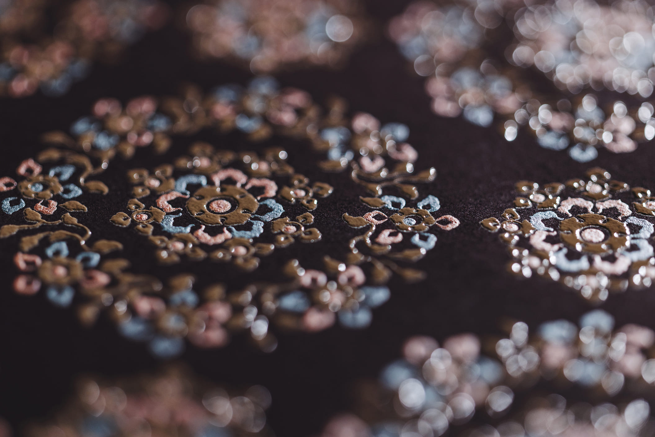 昨年より始まったプロジェクトの第2弾となる今年度は、夜光貝で華麗な花文が装飾された「螺鈿箱」の文様を使った印伝に挑みました。見る角度によって虹色の色合いと輝きが変化する螺鈿を革工芸である甲州印伝の技法でいかに表現するか。